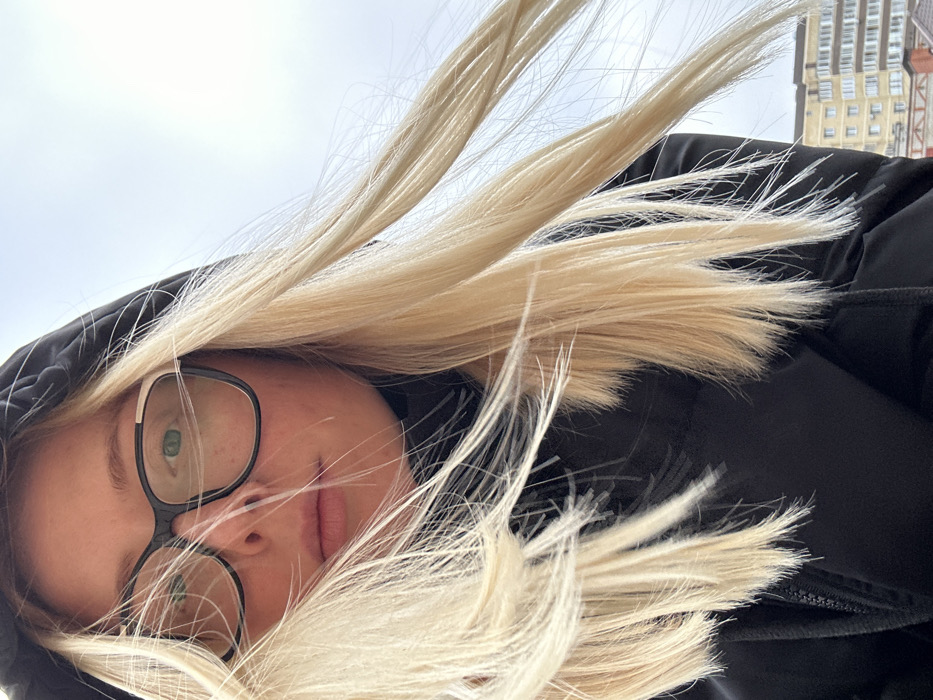 A low-angle close-up shows a person with blonde hair, wearing black-rimmed glasses, and a black hooded jacket. The hair is disheveled, partially obscuring the face. One eye is visible and appears to be green. The sky is overcast in the background, and a tall building is visible in the upper right corner, out of focus. The image is rotated counterclockwise.