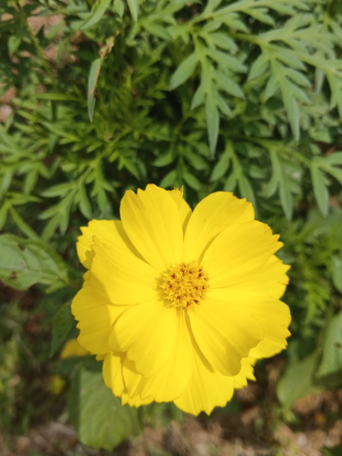 The image presents a close-up, top-down view of a single, bright yellow flower, likely a Cosmos sulphureus, centrally positioned in the lower half of the frame. The flower exhibits numerous overlapping, uniformly yellow petals with slightly wavy or irregular edges. Its central disk is composed of a dense cluster of small, orange-yellow florets. The background, largely out of focus, consists of green foliage with finely dissected leaves, typical of plants like cosmos or marigolds. A blurred patch of reddish-brown soil is visible in the bottom left corner. The scene is illuminated by direct natural light, casting faint shadows across some petals. This botanical detail is situated in the city of Ea Tê, Vietnam.
