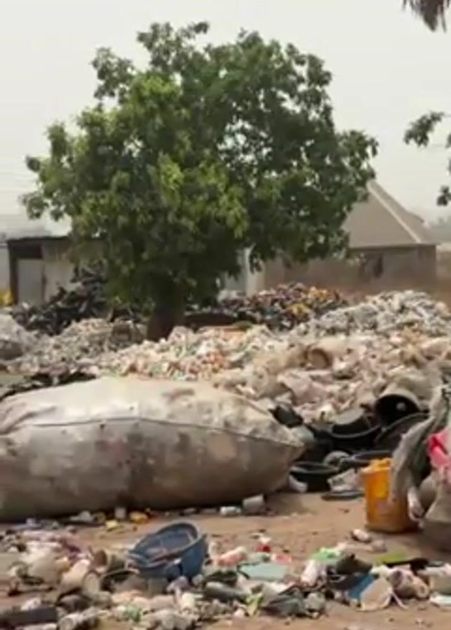 large dump of garbage and waste with several informal shacks or buildings in the background