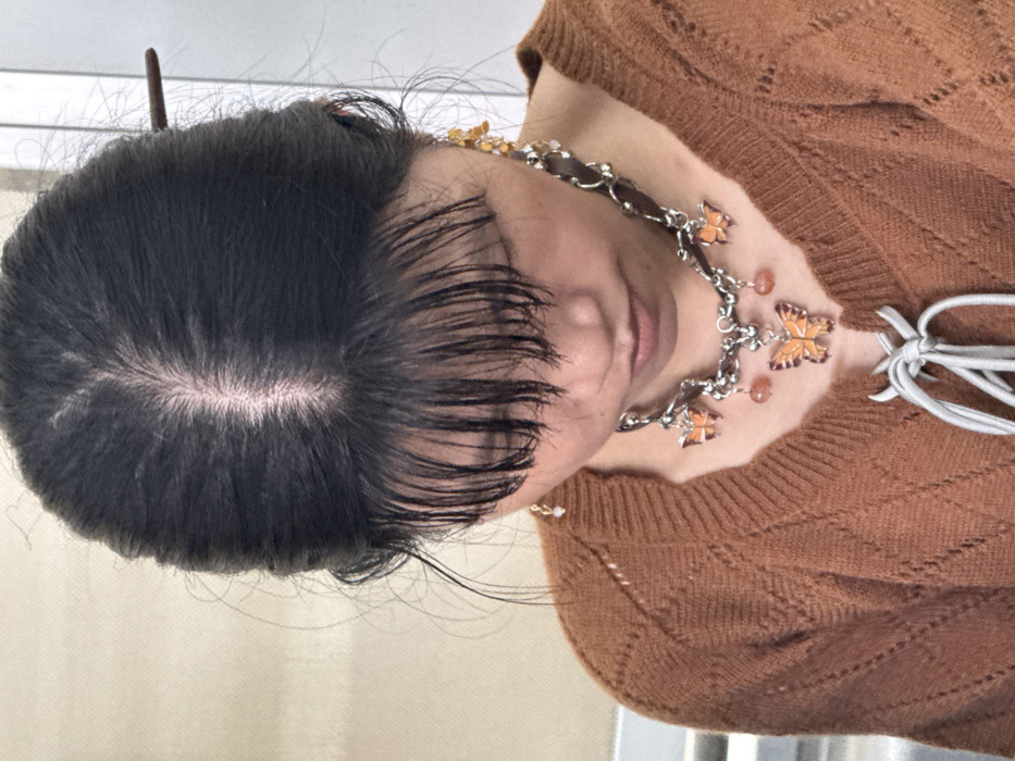 The image captures a close-up, top-down view of an individual with dark, straight hair, looking downwards. The person is positioned in a neutral, relaxed posture. The individual's dark hair is centrally parted, revealing a clear scalp, and styled upwards or pulled back, secured by a dark wooden hair stick protruding from the left side of the individual's head. Short, dark bangs cover the forehead and obscure the eyes, while some wispy strands frame the face. The nose and mouth are visible, displaying a neutral expression. The person is wearing a rust-brown knitted top or sweater with a distinct diamond-shaped or chevron-like knit pattern. The neckline features light grey or white laces tied in a knot at the center of the chest. Accessories include a prominent silver-toned chain necklace interwoven with dark brown material, possibly leather. This necklace is adorned with four bright orange-colored butterfly charms with detailed wings and four round, translucent orange or amber-colored beads. A delicate gold-toned dangle earring with a single white bead is visible on the individual's right ear. A cluster-style earring composed of multiple small yellow or amber-colored beads is visible on the individual's left ear. The background is an indistinct, light-colored surface, suggesting an indoor setting or a plain wall, out of focus. The scene is located in Yuzhong District, China.