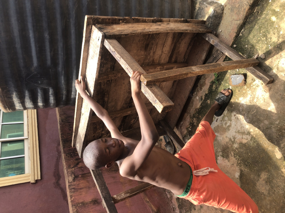 A young male is depicted outdoors in the city of Nkwelle, Nigeria. He is shirtless, wearing orange shorts with a green "SPORTS" waistband and white drawstring, and black geometric-patterned slides. He stands with legs spread, engaged in maneuvering a large, inverted, rectangular wooden table constructed from rough-hewn timber. His left hand grips an upper cross-member of the table frame, while his right hand holds a lower cross-member. The ground is an uneven concrete surface with patches of green growth. In the background, a reddish-brown building wall with dark stains features a horizontal window with light green frames and a yellow trim on the left. To the right, a dark, vertically oriented corrugated metal water tank with horizontal ridges and a faint white marking is visible. A dark shoe is present on the ground behind the male's left leg, and a small grey rectangular object lies near a table leg. Strong shadows suggest direct sunlight.