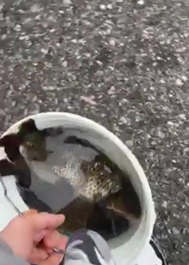 A hand holding the wire handle of a white bucket filled with water and two fish is shown in a brief video. The person wearing a grey camouflage patterned jacket and black and white shoes is standing near a white car with a chrome emblem that reads, "MATREX." The camera tilts as the person holds the bucket. The background is a gray asphalt surface.