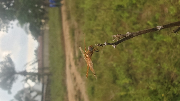 A dragonfly clings to a brown twig in this blurred outdoor shot. The dragonfly, wings outstretched, displays a vibrant orange hue. The twig, marked with white spots, reaches diagonally across the frame against a backdrop of green foliage and a blurred path. Sky and hints of a building sit in the distance on the left.