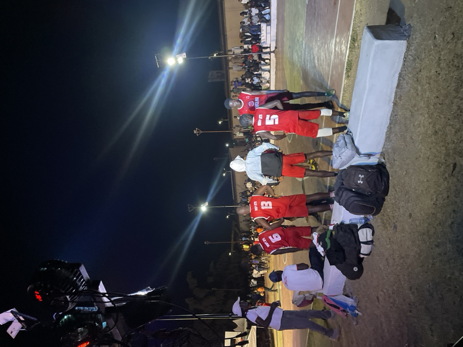 A nighttime outdoor basketball game is captured with overhead lights illuminating the court and surrounding area filled with spectators
