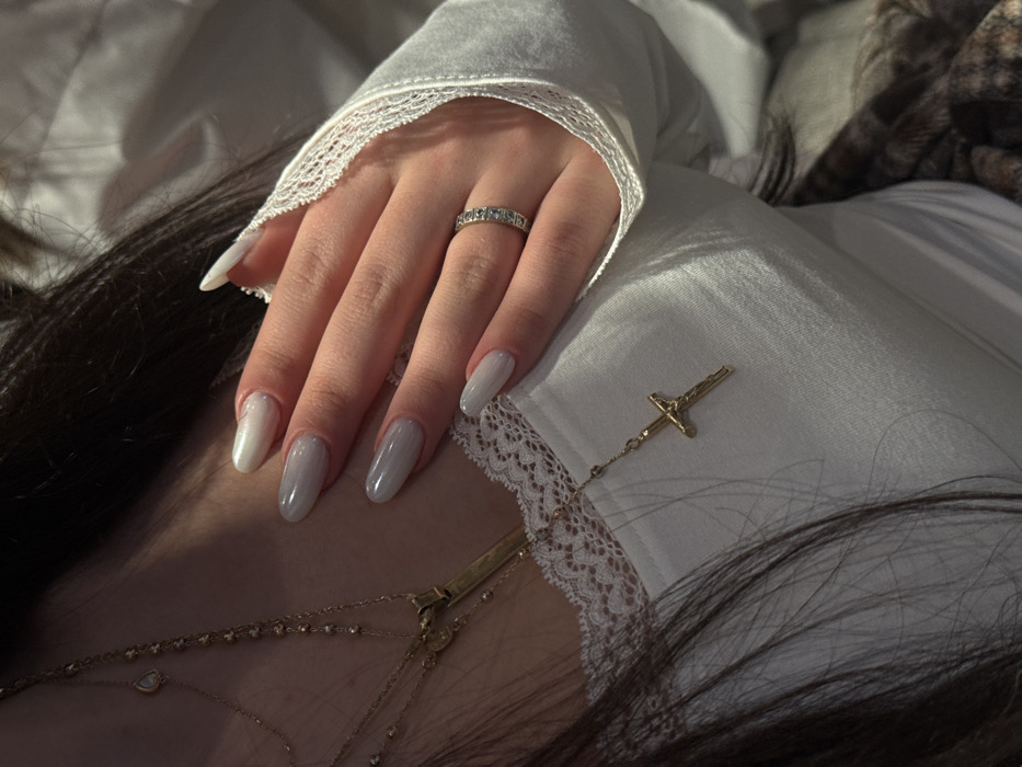 A woman's hand adorned with a diamond ring rests upon her chest. Her nails are long, with an iridescent white manicure. She wears a white lace-trimmed top. A golden rosary and delicate necklaces embellish her décolletage. Dark hair frames her face. The scene is softly lit, creating a serene and intimate atmosphere.