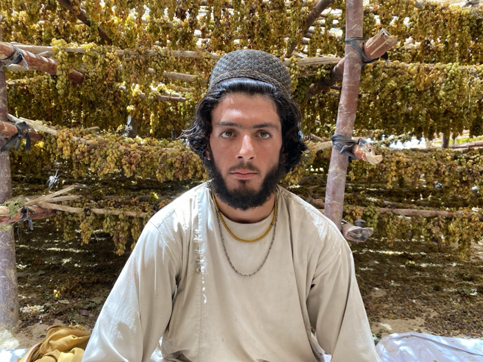 This image presents a detailed, head-and-torso portrait of a young adult male in an outdoor grape-drying facility located in Bazar-e Panjva'i, Afghanistan