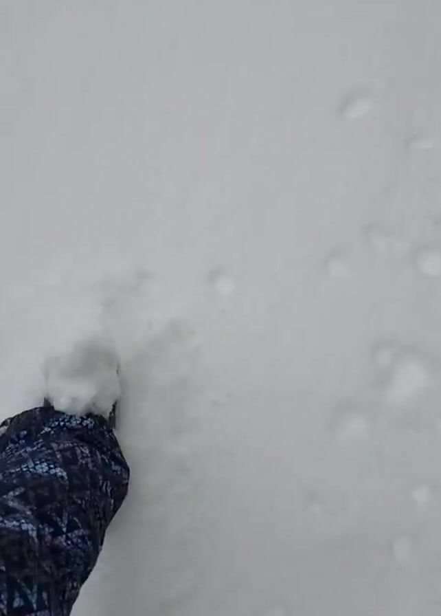The video begins with a close-up view of snow, focusing on the texture and footprints