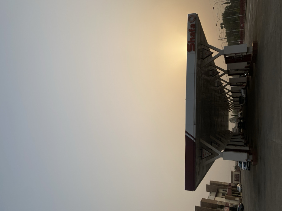 A gas station canopy is oriented vertically against a hazy, pale sky