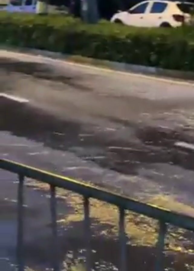 The video depicts a street scene at night, where the road is wet and reflective, possibly from rain or recently being cleaned. There are a few cars parked on the other side of a green median with bushes. The camera is positioned behind a metal barricade, and moves along it as the video progresses, focusing mostly on the ground, which is covered in what appears to be debris or leaves that are sparkling in the artificial light. The overall atmosphere is dimly lit and a bit unclear due to the darkness and camera movement.