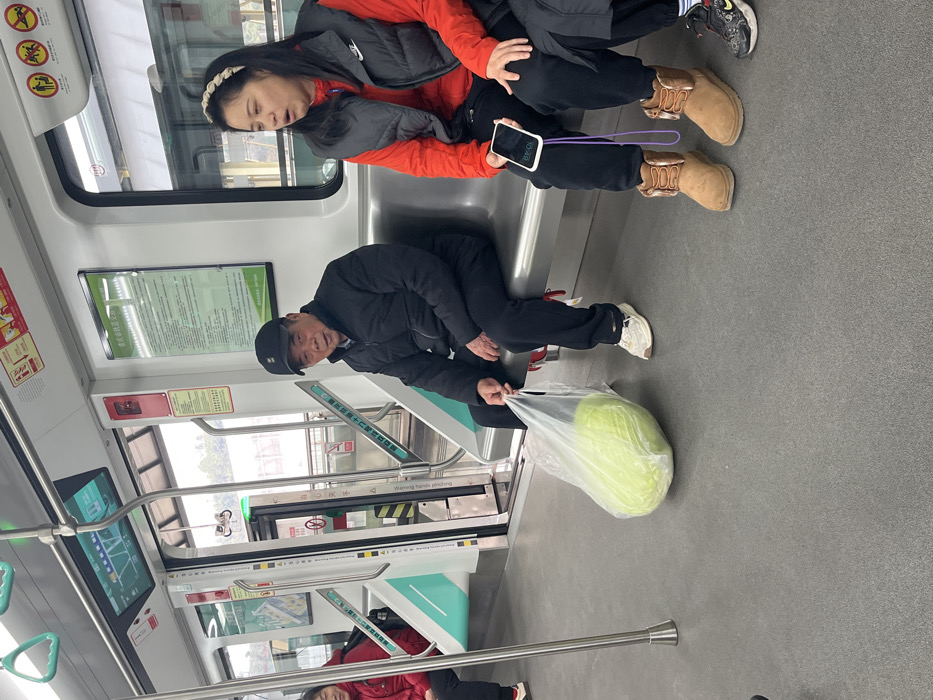 Inside a subway car, a man in a black jacket and cap sits, holding a clear plastic bag filled with large, green vegetables. Behind him, a woman in a red jacket leans against the window, holding a smartphone. Another person's legs are visible near the top right, sporting tan-colored boots. The subway interior features white walls, green accents, windows, and digital screens. The scene suggests a casual, everyday moment of commuting and errands.