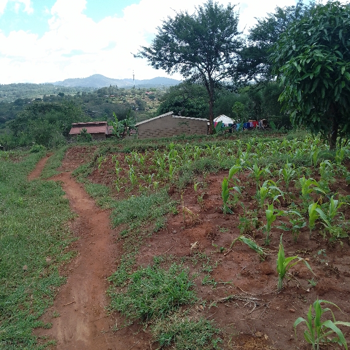 The image displays a rural landscape within Kola ward, Kenya, under a partially cloudy blue sky. In the foreground, a reddish-brown dirt path curves from the lower-left, bordered by green grass and weeds. To the immediate right, a cultivated field of reddish-brown soil is visible, containing rows of young, green maize plants in an early growth stage. In the midground, a light-colored, single-story building with a dark sloped roof is present, situated to the right of the path's bend. To its left, a portion of another building with a reddish-brown roof is visible, partially obscured by vegetation. Further right, behind the light-colored building, a small white tent-like structure is discernible, with various multi-colored clothes (red, blue, white) hanging on a line nearby. Several large trees with dense green canopies are scattered across the midground. The background consists of rolling hills and mountains covered in lush green vegetation, extending to the horizon. A communication tower or similar antenna is visible on one of the distant peaks, and scattered small structures are present on the distant slopes. No individuals are depicted in the scene.