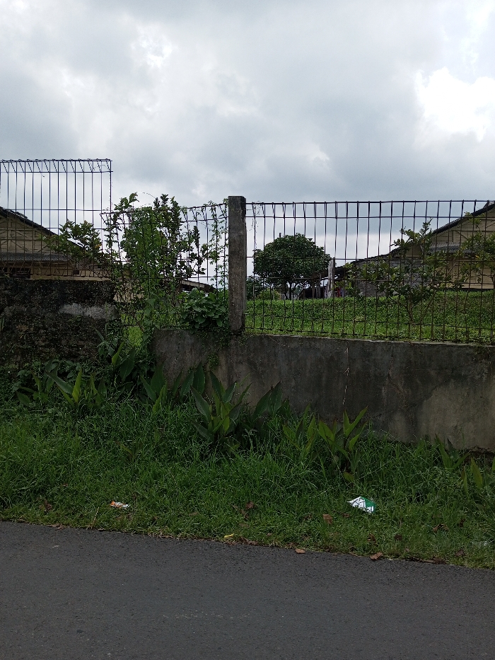 This image depicts a roadside scene in Vieng Phouka, Laos, under an overcast sky. The foreground shows a dark gray asphalt road spanning the bottom, bordering a grassy verge. On this verge, a small piece of white and green litter is visible amongst the green grass and several broad-leafed, upright green plants. Behind the verge, a weathered concrete retaining wall, approximately one meter high, extends horizontally across the frame, exhibiting discoloration and minor cracks. Above the concrete wall, a black metal wire mesh fence is installed, supported by concrete posts, with one prominent post centrally located. The fence's top edge on the far left appears to be damaged or incomplete. Lush green vegetation, including small trees and climbing vines, heavily overtakes the fence, particularly around the central post and the left side. Beyond the fence and vegetation lies an unkempt grassy field. In the middle ground, on the left, a partial view of a building with a light-colored facade and a dark roof is visible. Another similar building is partially discernible on the right side. Between these structures, behind the fence, a small, dense green tree stands. The background consists entirely of a uniformly cloudy sky, predominantly gray with some lighter white areas, indicating an absence of direct sunlight. No individuals or active movements are present in the scene.
