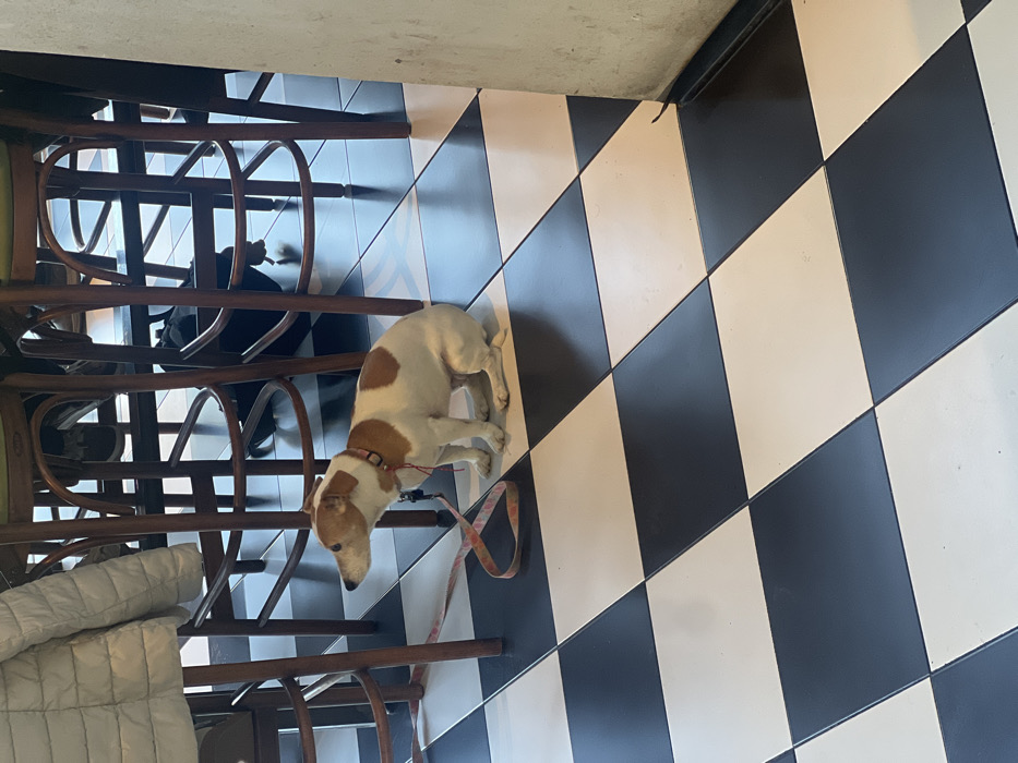 - "A Jack Russell Terrier-type dog, white with tan markings, is seated on a black and white checkered tiled floor" by FM-Tqqde2, licensed under CC BY 4.0