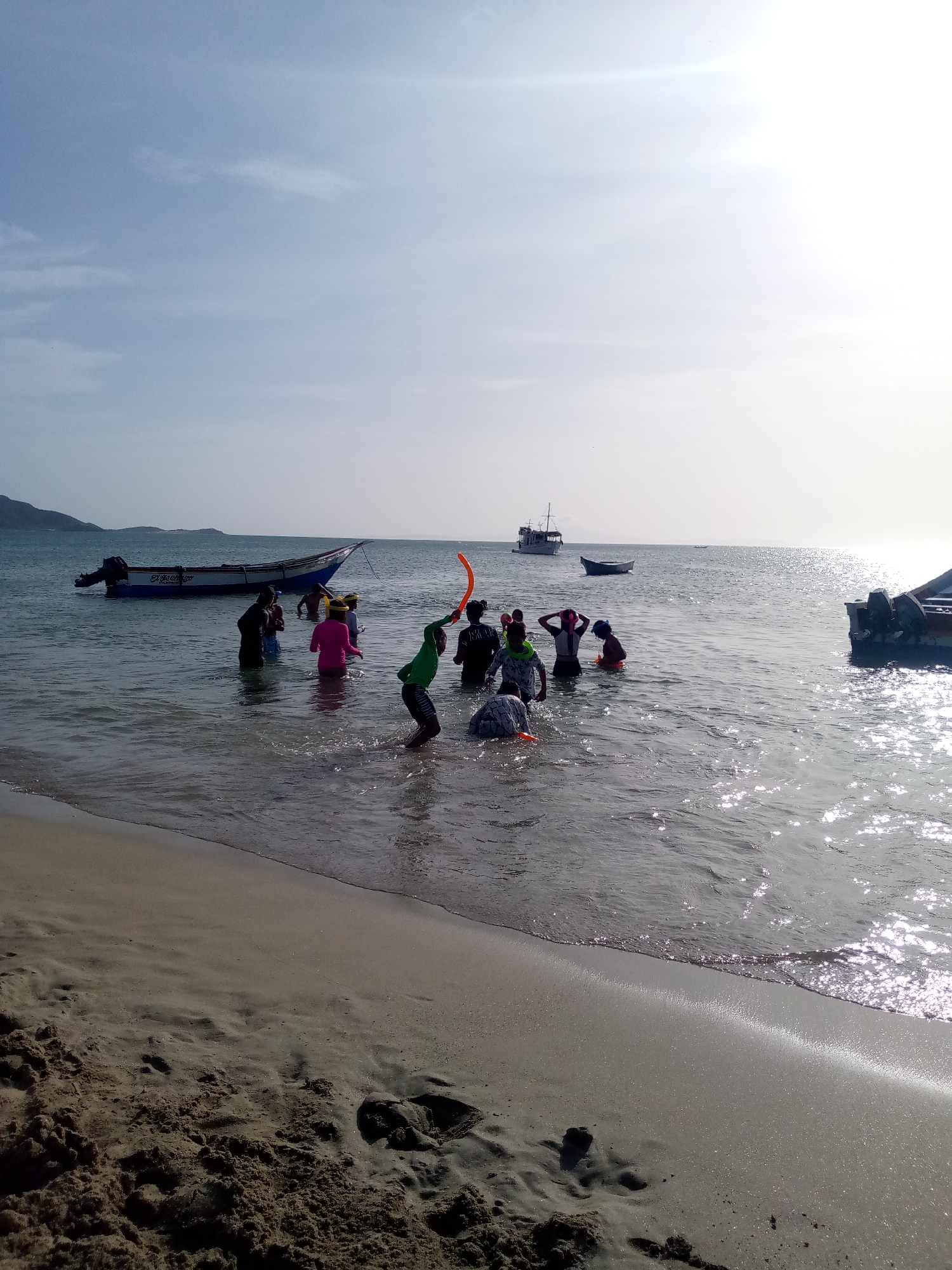 The image depicts a group of people wading in shallow water at a beach in Juan Griego, Venezuela. There are approximately eight individuals of varying ages visible, some partially submerged. One person is holding an orange object overhead. Several small fishing boats are anchored in the water nearby. The shoreline consists of a sandy beach with footprints. The water reflects sunlight. In the distance, a small island or landmass is visible. The sky is pale blue with some cloud cover.