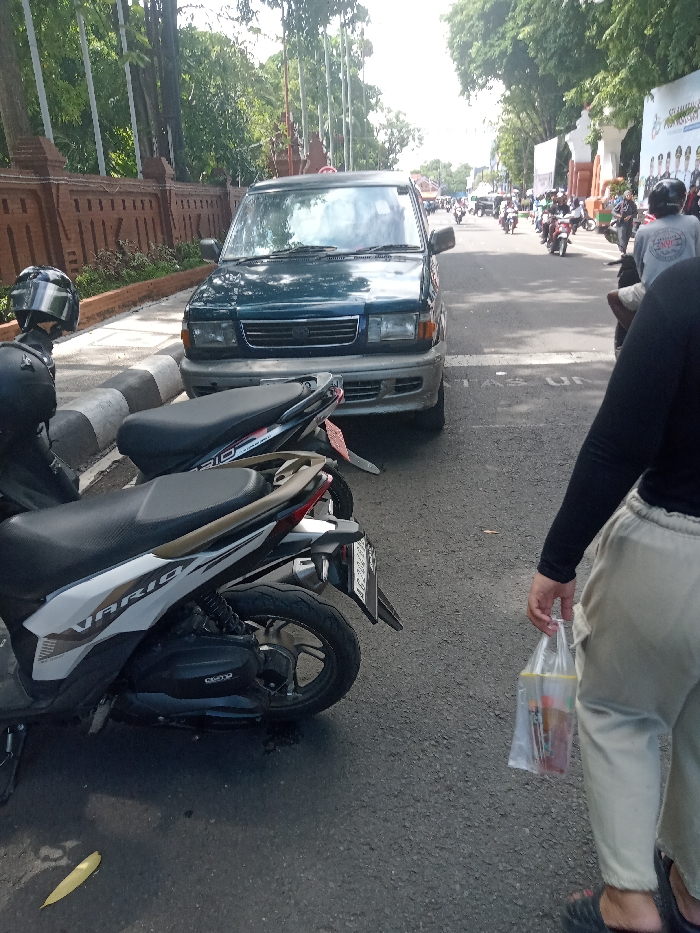 A daytime street scene in Nganjuk, Indonesia, captures a street with vehicle traffic and a pedestrian. In the immediate foreground, to the right, a person is partially visible from the mid-torso down, wearing a black long-sleeved shirt, light-colored trousers, and dark footwear, holding a transparent plastic bag containing unspecified items. To the left, two scooters are parked parallel to a striped grey and white curb; the closest is a white Honda Vario model. Adjacent to the scooters and curb, a dark green multi-purpose vehicle (MPV) is parked facing the camera. Along the left side of the street, a decorative brick wall borders a sidewalk and an area with tall trees. In the background, an asphalt road shows moderate traffic consisting primarily of motorcycles and scooters moving away from the viewer. Distant white arch-like structures with banners are visible on the right side of the road. Faint road markings reading "TAS UN" are present on the asphalt. The scene is illuminated by natural daylight.