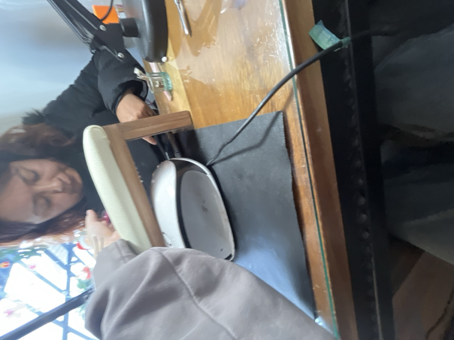 A desk scene features a person with dark hair wearing a black coat, sitting in a chair with a white cushioned back