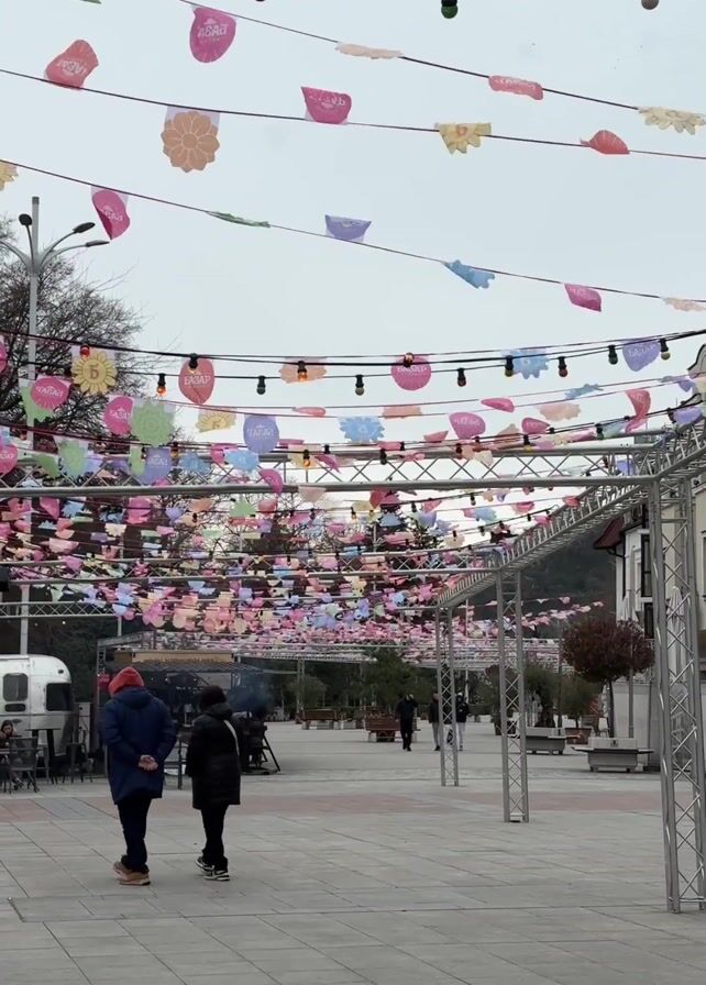 The video depicts an open pedestrian area decorated for an event