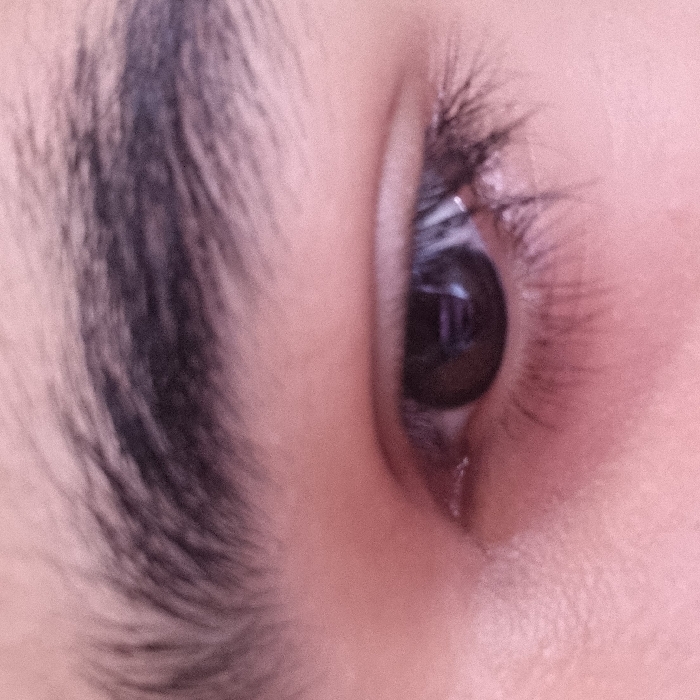 A close-up, high-resolution forensic image depicts a human left eye located in Sepang, Malaysia. The eye features a dark iris and a centrally located pupil, within which two distinct vertical light reflections are visible. Dark eyelashes are present on both the upper and lower eyelids. The surrounding skin exhibits a light pinkish tone with visible texture. Above the eye, a dense, dark eyebrow composed of individual hairs is present. No other subjects, objects, or environmental elements are discernible within the cropped frame. No actions or interactions are depicted; the eye is static.