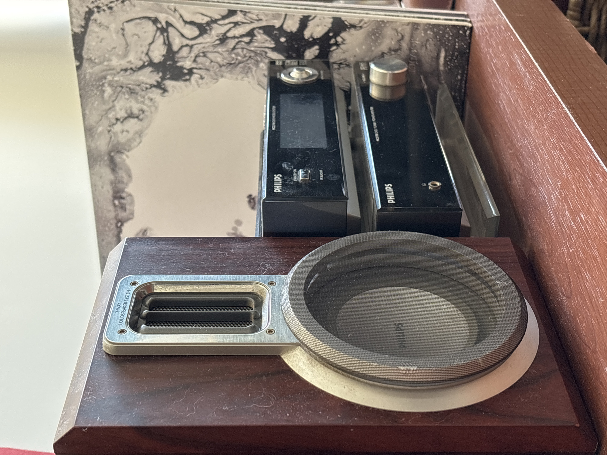 The image displays an indoor scene featuring audio equipment on a reddish-brown wooden surface