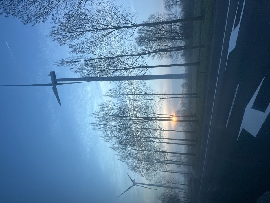 The image captures a rural or semi-rural landscape in Enspijk, Netherlands, during what appears to be sunrise or sunset due to the low sun and atmospheric conditions. The scene is dominated by a clear, light blue sky with faint, wispy clouds and a single white contrail in the upper right quadrant. In the foreground and mid-ground, a dark asphalt road is visible, featuring a solid white line on its left edge, a dashed white center line, and two prominent, large white directional arrows painted on the surface, indicating a forward or rightward trajectory. To the right of the road, a long, linear row of slender deciduous trees with bare branches extends into the distance, partially obscuring the horizon. Two large wind turbines are conspicuous; one occupies the upper right side of the frame, featuring a tall, textured column and three blades, with one blade positioned vertically. Another wind turbine is visible further down the road on the left, its blades also mostly static. Several smaller wind turbines are discernible in the hazy distance beyond the primary tree line. The sun, a bright, partially obscured disk, is low on the horizon behind the bare trees in the left-center, casting a warm orange glow through a distinct layer of atmospheric haze or fog that blankets the distant landscape and softens details. No individuals or explicit actions are visible within the scene. The overall environment presents a blend of infrastructure and natural elements.
