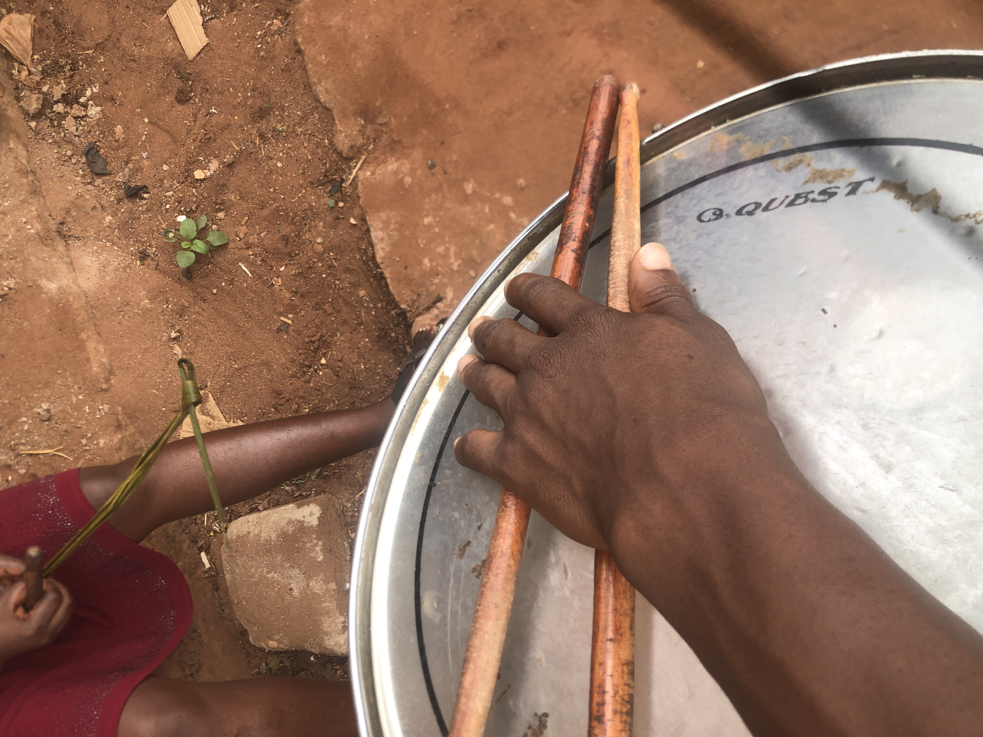A person, likely in Ukwu-Abwa, Nigeria, is seen drumming