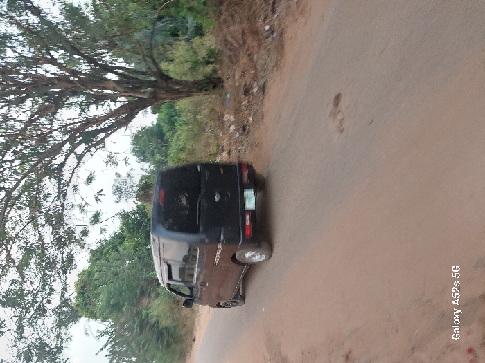 The image depicts a two-lane road in Umudioka, Nigeria. A dark-colored passenger van, likely black or dark grey, is shown moving away from the viewer, angled slightly to the right. The van has two visible red taillights and a light green or teal license plate at its rear, with characters that are illegible due to blur and distance. The road surface is paved, exhibiting visible wear and a small pothole in the foreground. Reddish-brown dirt shoulders flank both sides of the paved section. To the right of the road, a large, mature tree with extensive branches and sparse foliage stands, accompanied by dense green brush and scattered debris on the ground. The left side of the road features a dirt shoulder adjacent to dense green vegetation, including what appear to be palm trees further in the background. The sky is overcast or hazy. No individuals are present in the scene.