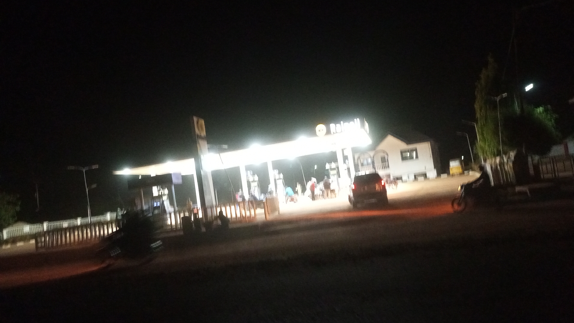 The image displays a nighttime scene at a Rainall petrol station located in Yelwa, Nigeria. The station is brightly illuminated by overhead lights under a canopy, revealing multiple fuel pumps. Several indistinct human figures are gathered around the pumps, suggesting activity. A prominent Rainall brand signpost, featuring a yellow logo, stands to the left of the canopy structure. To the right of the pumps, a dark-colored vehicle, consistent with an SUV or minivan, is positioned with its tail lights faintly visible. Behind the fueling area, a two-story white building with dark windows and a balcony is present, likely serving as the station's office or convenience store. On the far right, a silhouette of an individual riding a motorcycle is visible, moving rightward on a dark, unpaved surface in the foreground. Streetlights are present on both the left and far right sides of the frame. Dark trees and foliage are discernible on the right side of the road, and a white fence or barrier runs along the left edge of the foreground. The sky is dark, indicating night.