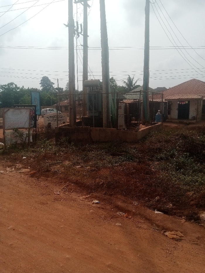 The image depicts an outdoor scene in Ajibade, Nigeria, centered around electrical utility infrastructure