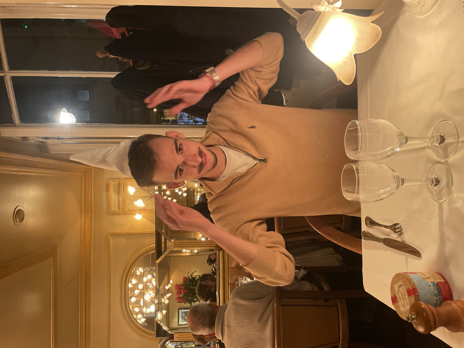The image depicts an indoor restaurant scene at night in Montpellier, France. A young adult male, with short brown hair, a thin mustache, and a goatee, is seated at a table, looking directly at the camera with a subtle smirk. He wears a tan quarter-zip pullover sweater with a small dark embroidered logo on the left chest, over a white undershirt. A white, cone-shaped object, resembling a folded napkin, is positioned on his head. His hands are raised on either side of his head, fingers slightly spread, as if making a gesture. A watch and a red bracelet are visible on his left wrist. The table in the foreground is covered with a white tablecloth, displaying two empty stemmed glasses, a small knife, and a small fork. To the left, a wooden pepper mill and a round, light blue container with a partially visible red and white label are present. A decorative table lamp with a frosted, flower-shaped glass shade illuminates the right side of the table. The background shows an ornate restaurant interior with warm, dim lighting. Gold-colored walls with decorative molding and large mirrored sections reflect light from wall sconces and a chandelier-like fixture. An older male patron with gray hair is partially visible, seated at another table to the left. A large window behind the main subject reveals a dark exterior with the faint illumination of a streetlamp, and dark garments hang on a rack adjacent to the window.
