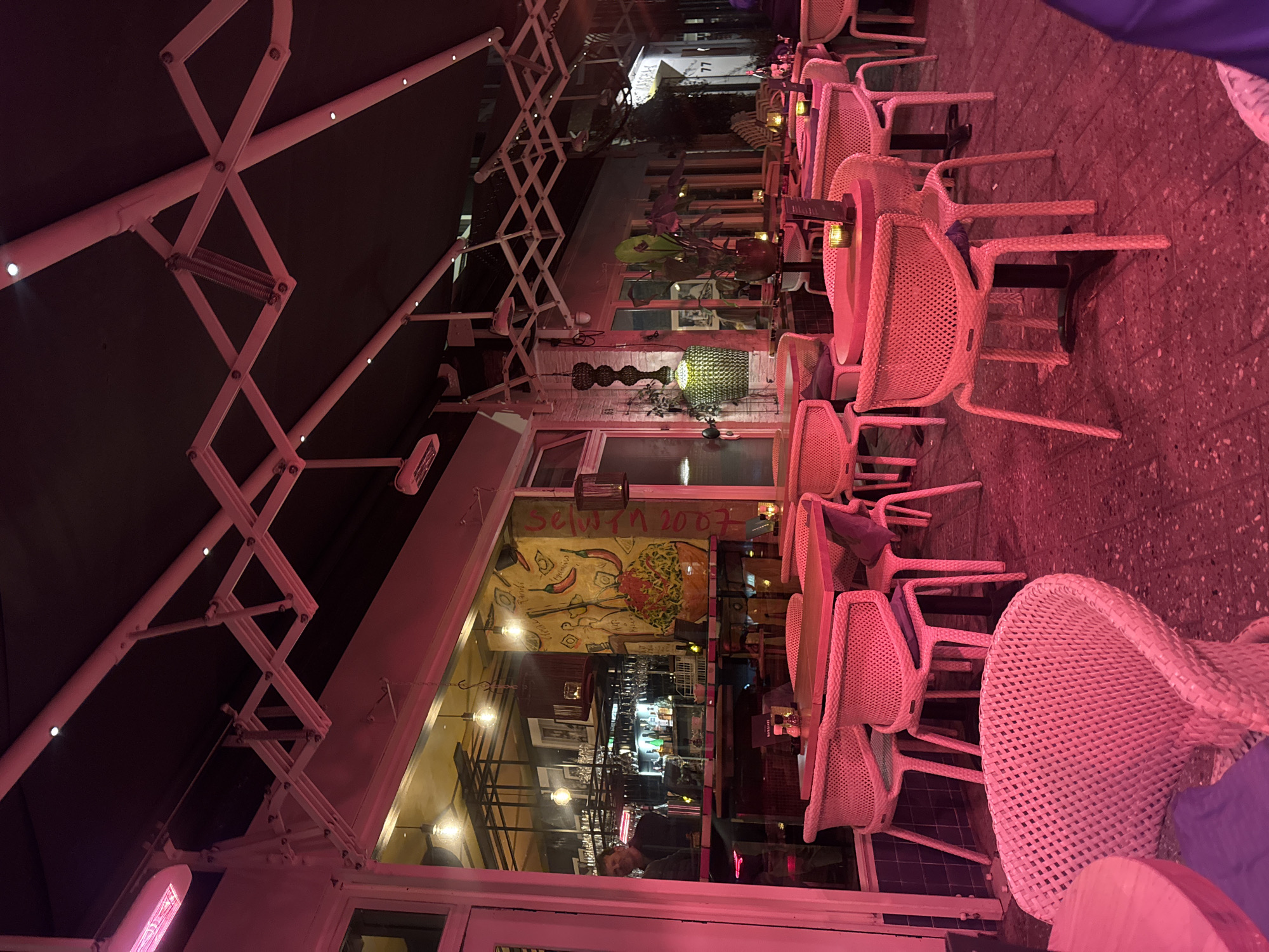 This image depicts the outdoor seating area of Selam Pizzeria Grill Restaurant at Kleine Berg 73, Eindhoven, Netherlands, at night. The scene is bathed in a predominant pink-red artificial light, emanating from overhead heaters mounted beneath a dark retractable awning supported by a white, scissor-lattice metal frame. The foreground and midground feature numerous vacant outdoor tables and chairs. The chairs are light-colored, woven wicker-style, and some tables hold small, illuminated candles, menus, and condiment shakers. The ground surface is a speckled, dark-colored paving or tile. To the left, a large glass window reveals the restaurant's interior bar area, where a male individual, presumably a staff member, is visible behind the counter, looking towards the camera. The interior wall features a vibrant mural with chili peppers and the text "Selam 2007." Above the bar, various bottles and suspended glassware are arranged. Architectural elements visible include a building facade with address numbers "69" to the left and "77" further down the street to the right. A distinctive dark green, segmented glass chandelier hangs from the awning structure on the left side. Additional potted plants are distributed among the tables. No direct interactions are occurring in the outdoor seating area.