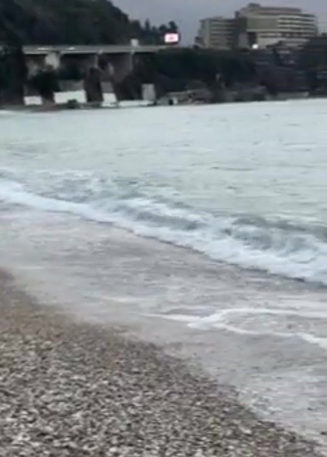 pebbled beach with waves lapping the shore under an overcast sky. The waves are small and foamy. In the background, a building sits on a hill, and a highway runs along the coast. There are no people visible in the scene. The camera slowly pans from left to right across the scene.