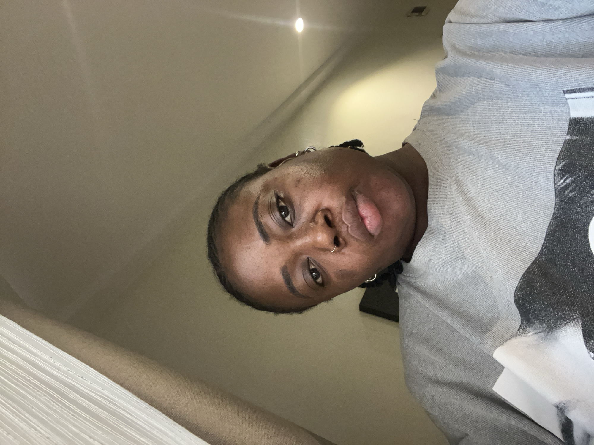 A female individual with dark skin, braided hair, a silver nose ring on the left nostril, and silver hoop earrings on both ears is captured in a close-up, slightly upward-angled shot. She wears a light grey crew-neck t-shirt featuring a monochrome graphic print on the chest. Her expression is neutral with slightly pursed lips, and she gazes directly at the camera. The background is out of focus, revealing an indoor setting with a white, textured vertical element (likely a curtain or blind) and a light brown/beige vertical element on the left. The remaining background consists of a plain light beige wall or ceiling, with a single warm-toned light source visible in the upper right portion. The specific location within the city of Abuja, Nigeria, cannot be determined from the visual information present in the image.