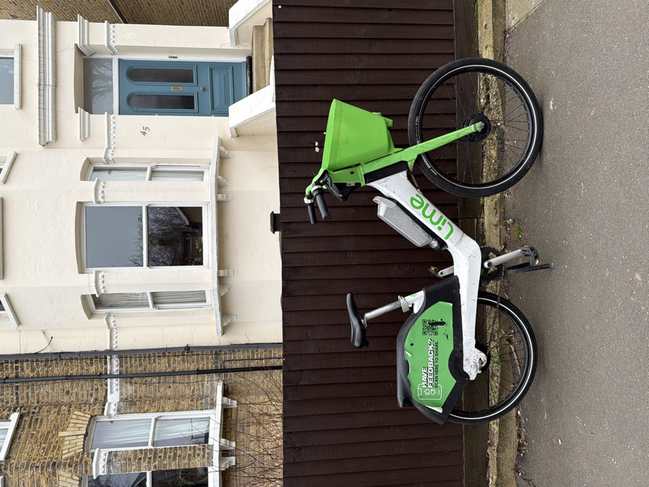 - "A white and bright green Lime e-bike is parked on a grey asphalt pavement, supported by its extended kickstand" by FM-OGhD02, licensed under CC BY 4.0