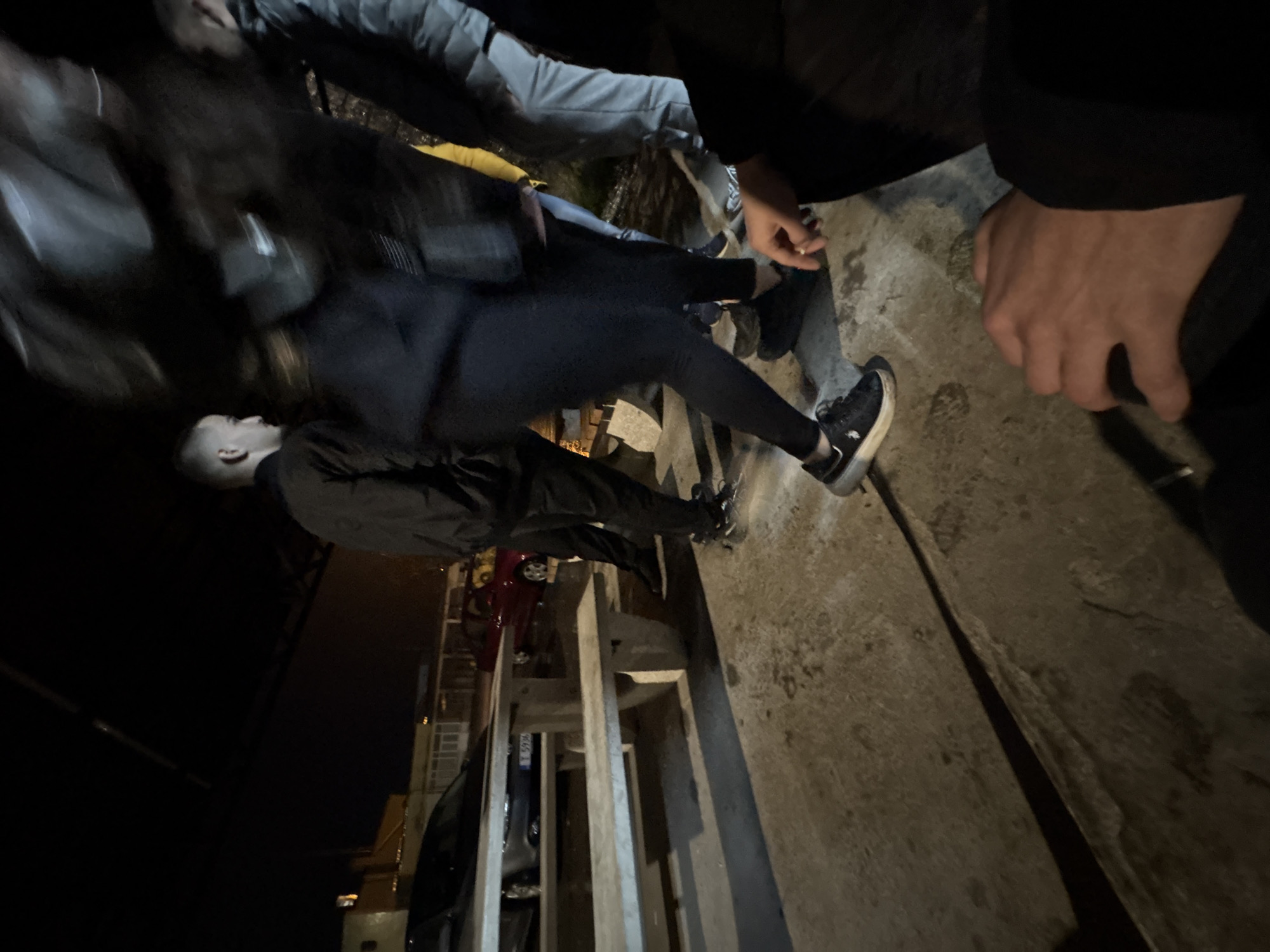 The image depicts a nighttime outdoor scene in Targovishte, Bulgaria. The ground is a concrete surface, appearing somewhat damp or stained, with a visible concrete drainage channel. Illumination is provided by artificial light sources, casting shadows. In the immediate foreground, to the bottom right, a person's hand holds a lit cigarette. At least five individuals are present. A person wearing dark leggings and a dark jacket, with black sneakers, is captured in motion in the midground, their upper body significantly blurred. To the left of this blurred figure, a male with short hair and a dark jacket is seen in profile, looking towards the right. To the right of the blurred figure, a male in a grey puffer jacket and light-colored pants is partially visible from behind, alongside another person wearing a yellow garment. A light-colored, robust concrete picnic table with benches occupies the left-midground. Behind the table, a dark-colored sedan, possibly an Alfa Romeo with Bulgarian license plate "T 5936," is parked. Further in the background, to the right of the sedan, a red car is partially visible. Dimly lit buildings are present in the distant background.