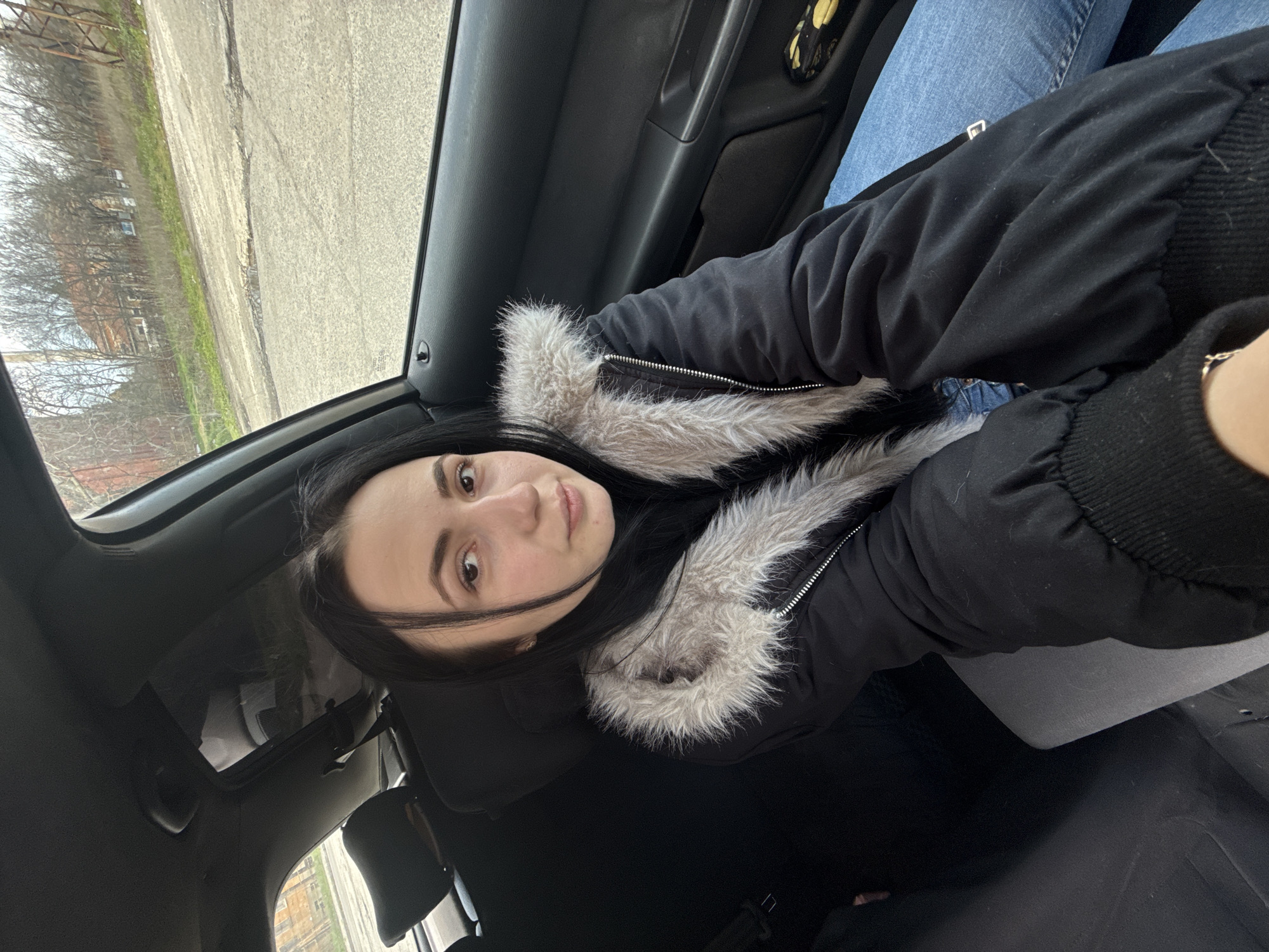 A female subject is depicted seated in the rear passenger compartment of a vehicle, positioned to capture a self-portrait. She has dark, straight hair, a light complexion, and is wearing a black padded jacket with a prominent light grey faux fur collar over a dark, high-neck garment, along with blue jeans. A silver-colored bracelet is visible on her right wrist. The vehicle's interior features dark upholstery and trim. Through the vehicle's windows, an exterior environment consistent with the city of Yambol, Bulgaria, is visible. The vehicle is situated on a cracked asphalt road that displays visible potholes, one containing water. The surrounding landscape consists of barren deciduous trees and dry, grassy terrain, suggesting a cooler season. In the background, partially obscured by the trees, stands an older multi-story building with a red-tiled roof. To the far left, a tall, reddish-brown industrial structure or chimney is present, and to the far right, a section of a large metal lattice tower is visible, indicative of an industrial or semi-urban area. The sky appears overcast.