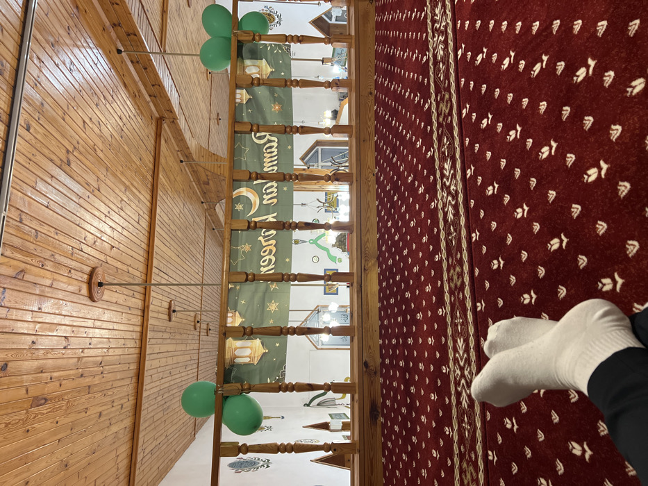 The image depicts the interior of a mosque in Kornitsa, Bulgaria, viewed from an elevated section. In the foreground, a person's feet, clad in white socks and dark trousers, are crossed and resting on a red carpet. The carpet features a repeating pattern of white stylized floral motifs and a central horizontal ornamental border. A wooden railing with turned balusters separates the foreground from the lower section of the mosque. Draped behind or over the railing is a green banner with gold-colored text, appearing reversed ("meeR naR"), along with crescent moon, stars, and lantern motifs. Green balloons are attached to the wooden railing on both the left and right sides. Through the railing, the white-walled lower level of the mosque is visible, adorned with light fixtures, calligraphic designs, and additional decorative elements. The ceiling is constructed of light-brown wooden panels, from which multiple light fixtures are suspended by thin rods.