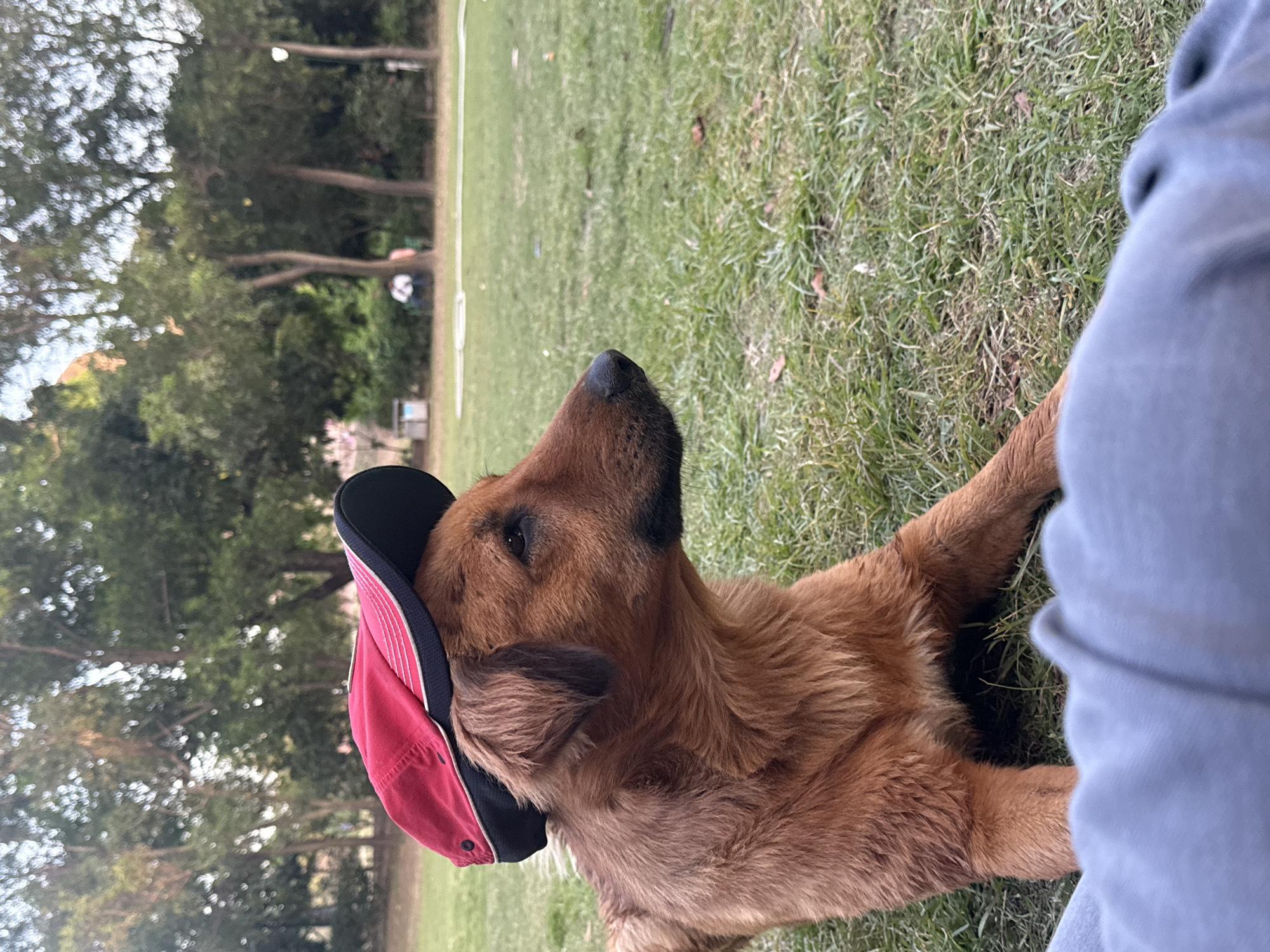 A reddish-brown dog is observed lying on a grassy area within a park in New Delhi, India. The dog wears a red and black baseball cap, positioned backward on its head, and faces to the right. Its snout is dark, and its fur is medium-length. A human leg, clad in grey fabric, occupies the lower foreground. The environment features a green lawn with sparse patches, leading to a background composed of numerous trees with green foliage. Two blurred human figures are visible in the distant background, one appearing seated. A light-colored utility container is present on the left side of the midground.