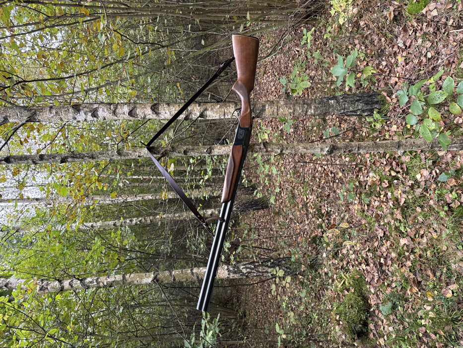 - "A double-barrel over-under shotgun, featuring dark metallic barrels and a brown wooden stock, is suspended horizontally in a dense forest" by FM-osXZC2, licensed under CC BY 4.0