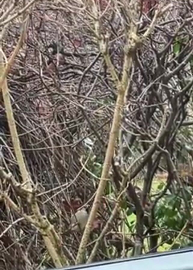 shrub with many intertwined branches, primarily bare, with some green leaves visible at the lower right. A bird with a reddish breast and gray wings is partially obscured by the branches. The video is taken from inside a vehicle, as evidenced by the edge of a car window visible at the bottom. The background behind the shrub appears to be a red brick wall. The overall scene appears to be outdoors in a somewhat overgrown garden.