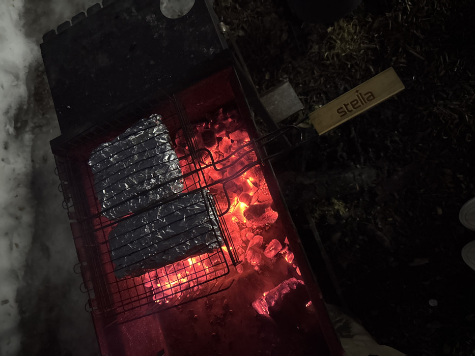 This image depicts an outdoor night scene in Mishkino, Russia. A dark metal barbecue grill (mangal) is centrally positioned, containing glowing red charcoal embers. A rectangular metal grilling basket, designed to hold food, rests directly over these coals. Inside the grilling basket, two elongated items are visible, completely encased in reflective aluminum foil, actively being cooked or heated by the embers below. The grilling basket features a wooden handle, located in the lower right portion of the frame, which bears the word "stella" in a light-colored font. In the upper background, a snow-covered surface is discernible, indicating cold weather conditions. The immediate foreground shows dark ground, possibly covered with sparse vegetation or debris, and the tips of a person's light-colored shoes (likely white sneakers) are visible at the very bottom edge, suggesting a person is standing near the grill. The primary illumination in the scene emanates from the intensely glowing coals, casting a warm red hue. No other individuals are visible.