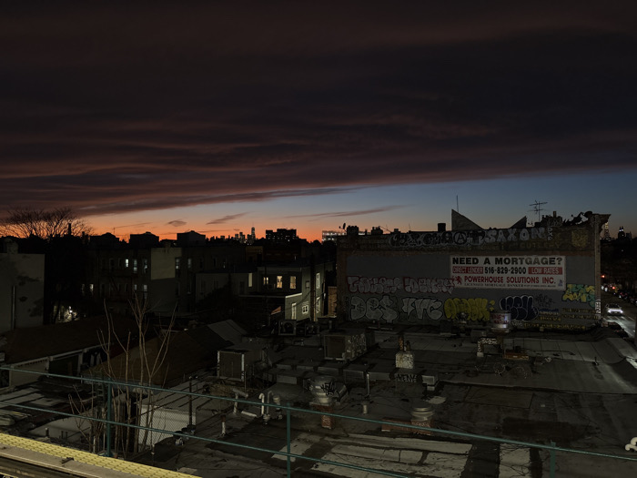 This image captures an urban landscape in Brooklyn, New York City, United States of America, during dusk or dawn