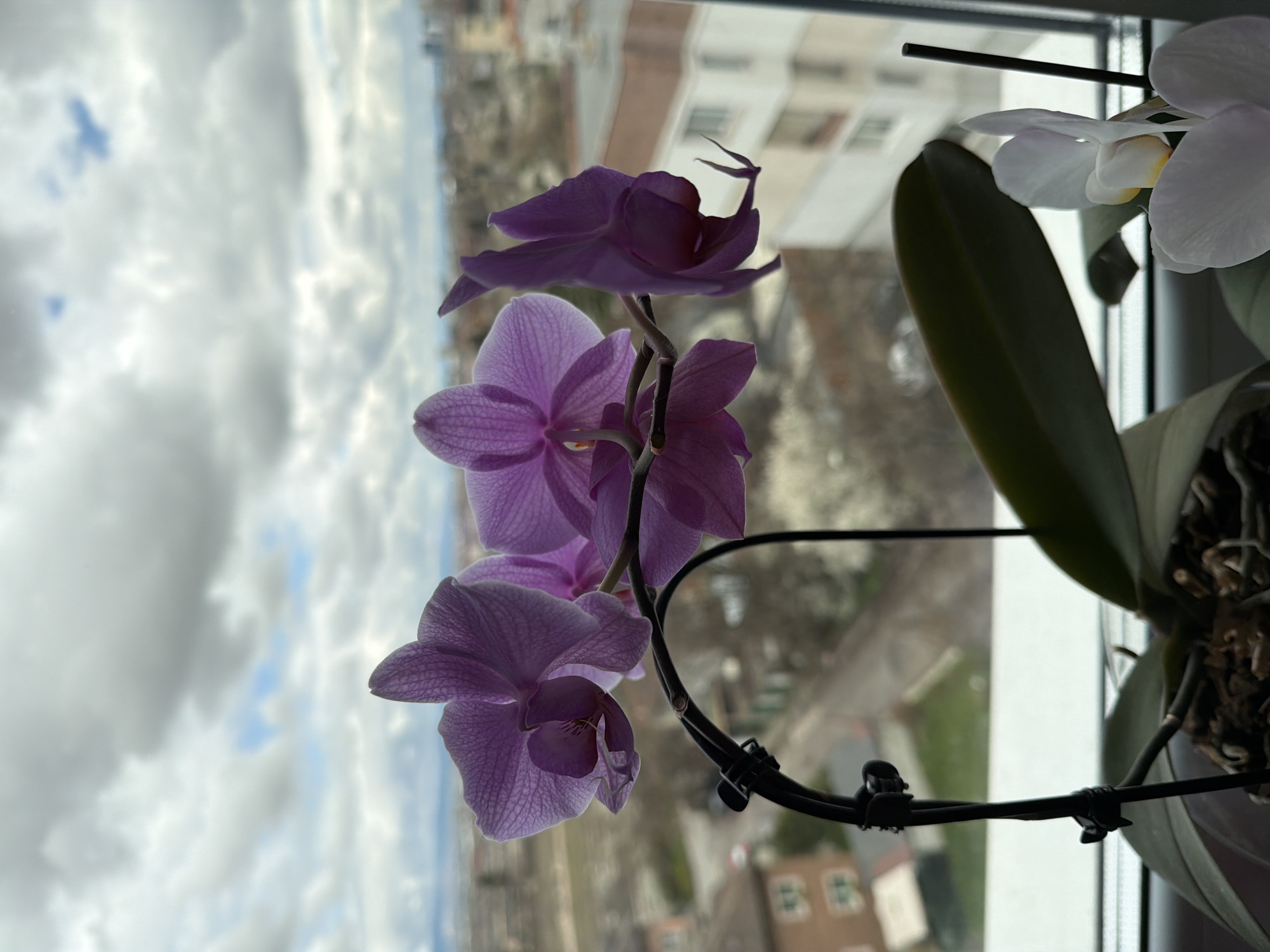 close-up of purple and white orchid flowers in a pot, positioned near a window. The window overlooks an urban landscape, identifiable as Sofia, Bulgaria, based on architectural styles and visible urban features. Buildings of varying heights and construction types are visible, suggesting a residential or mixed-use area. The sky is overcast with predominantly gray clouds. The orchid stem is supported by a black wire structure. Roots and potting medium are visible in the pot.