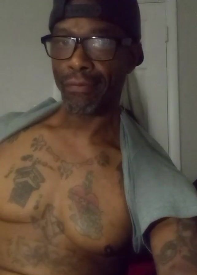 A medium shot depicts a man with dark skin, wearing a gray baseball cap, black-framed glasses, and a light gray shirt draped over his shoulders. The man is shirtless, exposing numerous tattoos on his chest and right arm. He has a short, graying beard and appears to be looking directly at the camera with a slight smile. Behind him, there is a white door and a light gray wall. The lighting in the room seems dim and even.