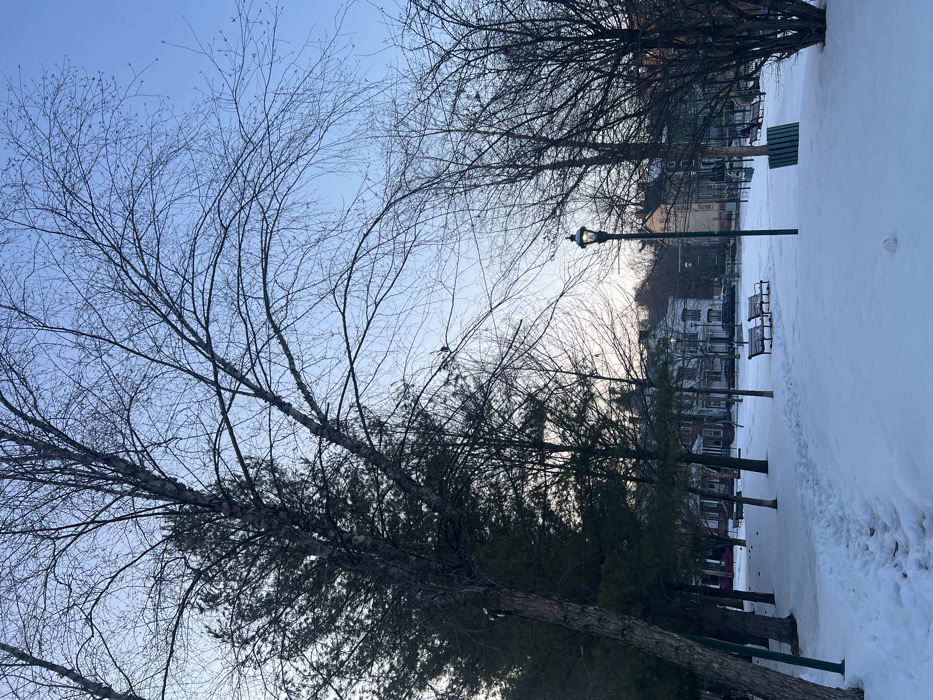 A winter scene depicts a snow-covered park with bare trees. A line of evergreen trees and benches is visible in the background, leading to residential buildings. A vintage-style lamppost stands among the trees. The sky is pale blue, suggesting either early morning or late afternoon light. Footprints are visible in the snow, indicating recent activity.