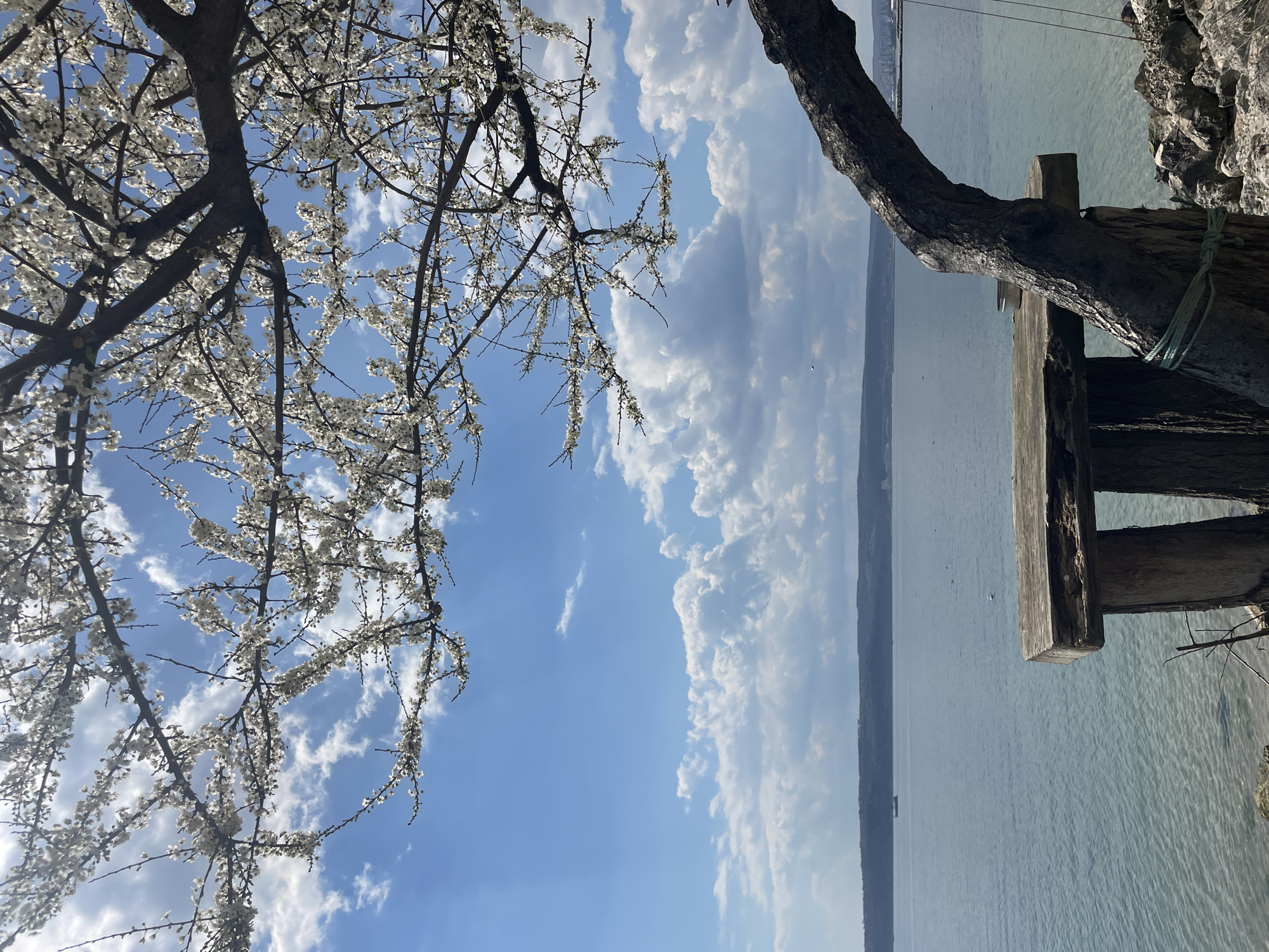 scene in Varna, Bulgaria, featuring a view of the sea and sky framed by trees. On the left, a tree with white blossoms covers a portion of the sky. The sky is blue with numerous white clouds. In the foreground on the right is a tree trunk with weathered wooden structures attached. Below the horizon line, water extends towards the distance.