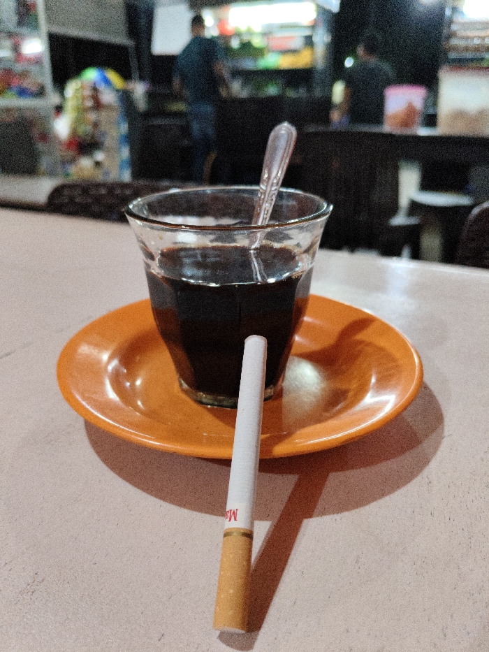 - "The image presents a close-up, static shot of a beverage and a cigarette on a light-colored tabletop in what is indicated to be a casual eatery in the city of Cut, Indonesia" by FM-bZrK33, licensed under CC BY 4.0