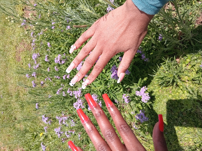 This image displays two hands positioned in an outdoor environment characterized by dense green vegetation and small purple flowers, located in Germiston, South Africa. The left hand, exhibiting dark skin, features five long, glossy, bright red, square-tipped artificial nails. The right hand, also with dark skin, displays five long, square-tipped artificial nails with a French tip style, comprising clear or light pink bases with white tips, and further adorned with small black and white decorative patterns on several nails. A portion of a teal-colored fabric sleeve is visible on the wrist of the right hand. The hands are elevated slightly above the foliage. The background consists of various leafy green plants and numerous clusters of small, light purple flowers. The scene is illuminated by bright natural sunlight, casting distinct shadows, notably beneath the left hand.
