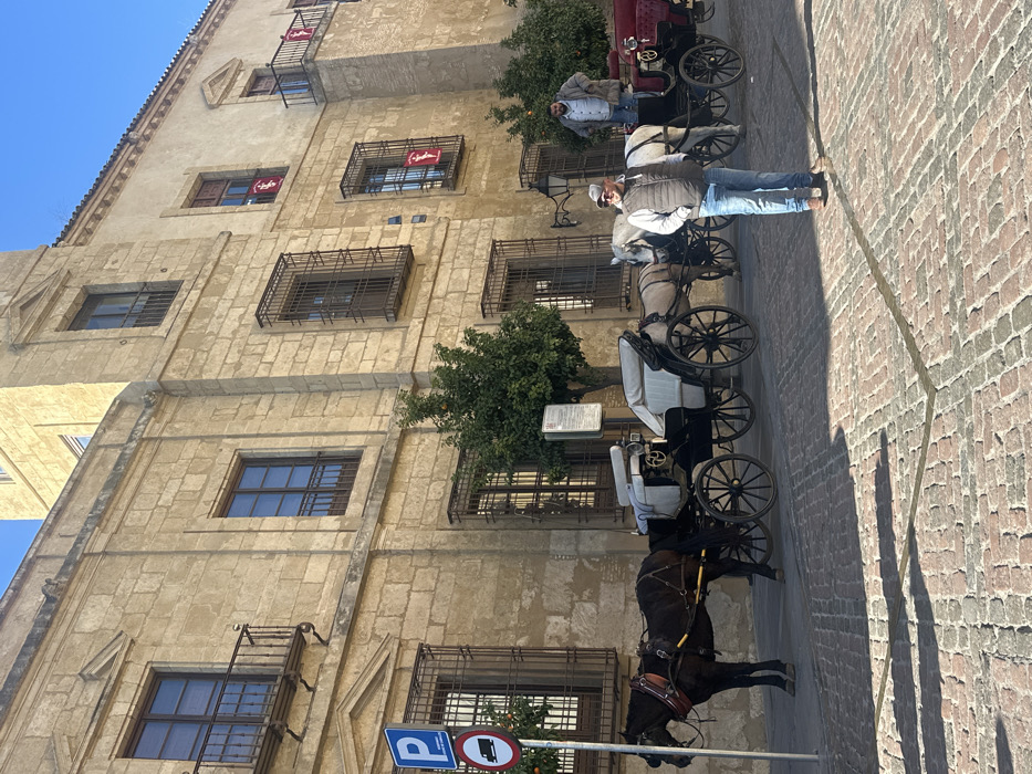 The image depicts a street scene in the historic center of Córdoba, Spain, characterized by traditional architecture and horse-drawn carriages