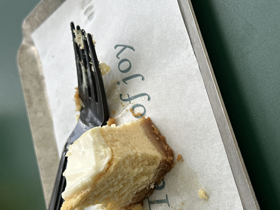 - "A partially consumed slice of cheesecake with a white topping and a brown crumb crust rests on a white paper liner within a silver-colored metallic tray" by FM-jqiIm2, licensed under CC BY 4.0