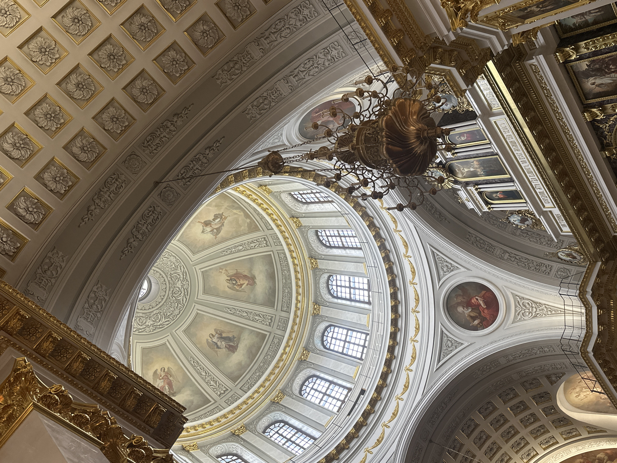 The image captures the interior of a grand religious building, likely a cathedral, in Kazan, Russia. The camera is pointed upwards, showcasing the elaborate ceiling and dome architecture. The ceiling features a grid pattern of square panels with floral designs, painted or sculpted. Arched sections decorated with intricate molding lead to a large, central dome. The dome is adorned with frescoes of angels and figures in the sky, along with a ring of arched windows providing natural light. A large, ornate chandelier hangs from the ceiling, adding to the opulence of the space. Gold detailing is prevalent throughout the structure, highlighting architectural features and ornamentation. The building appears to be empty, without any visible people or activities.